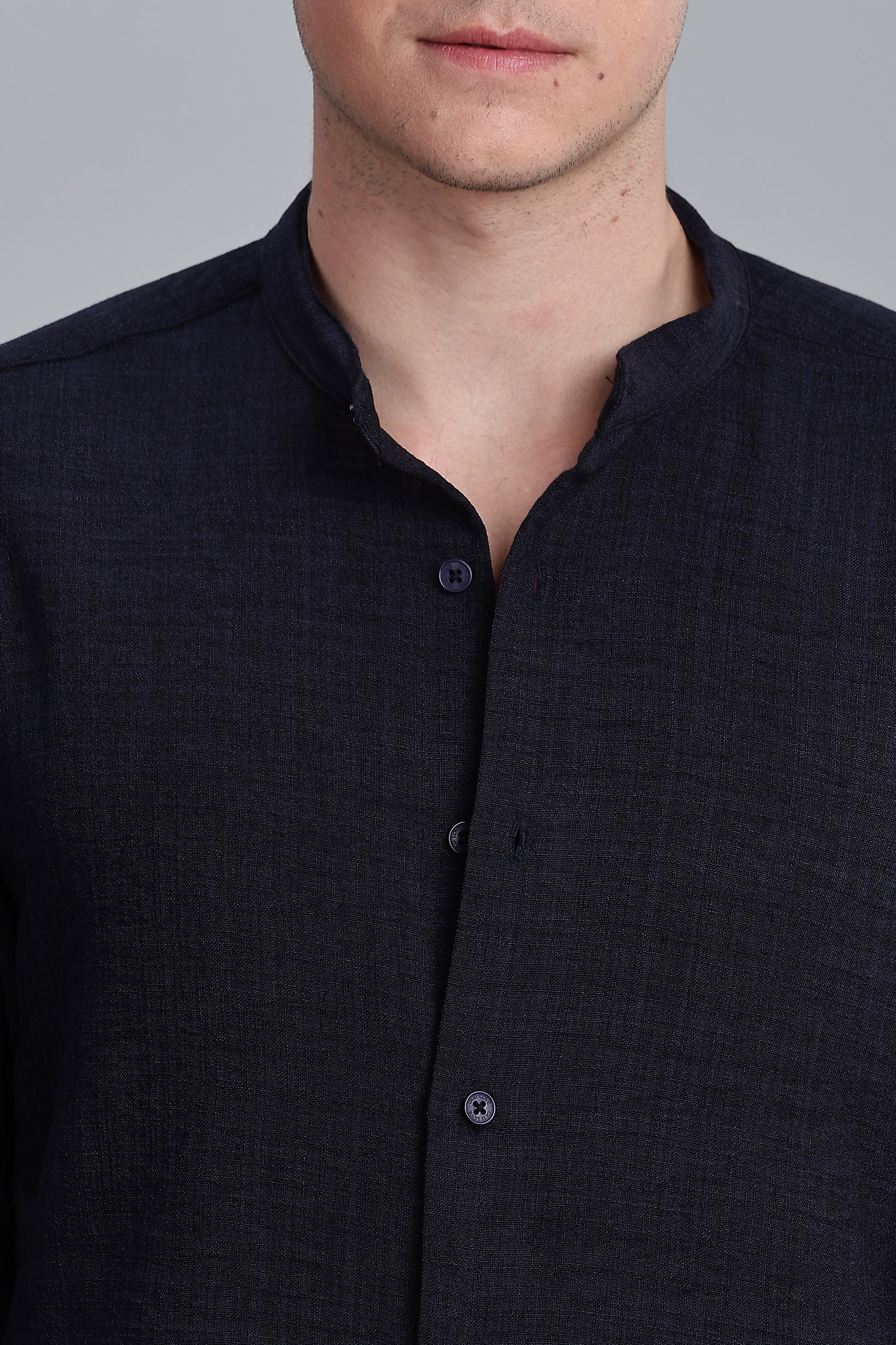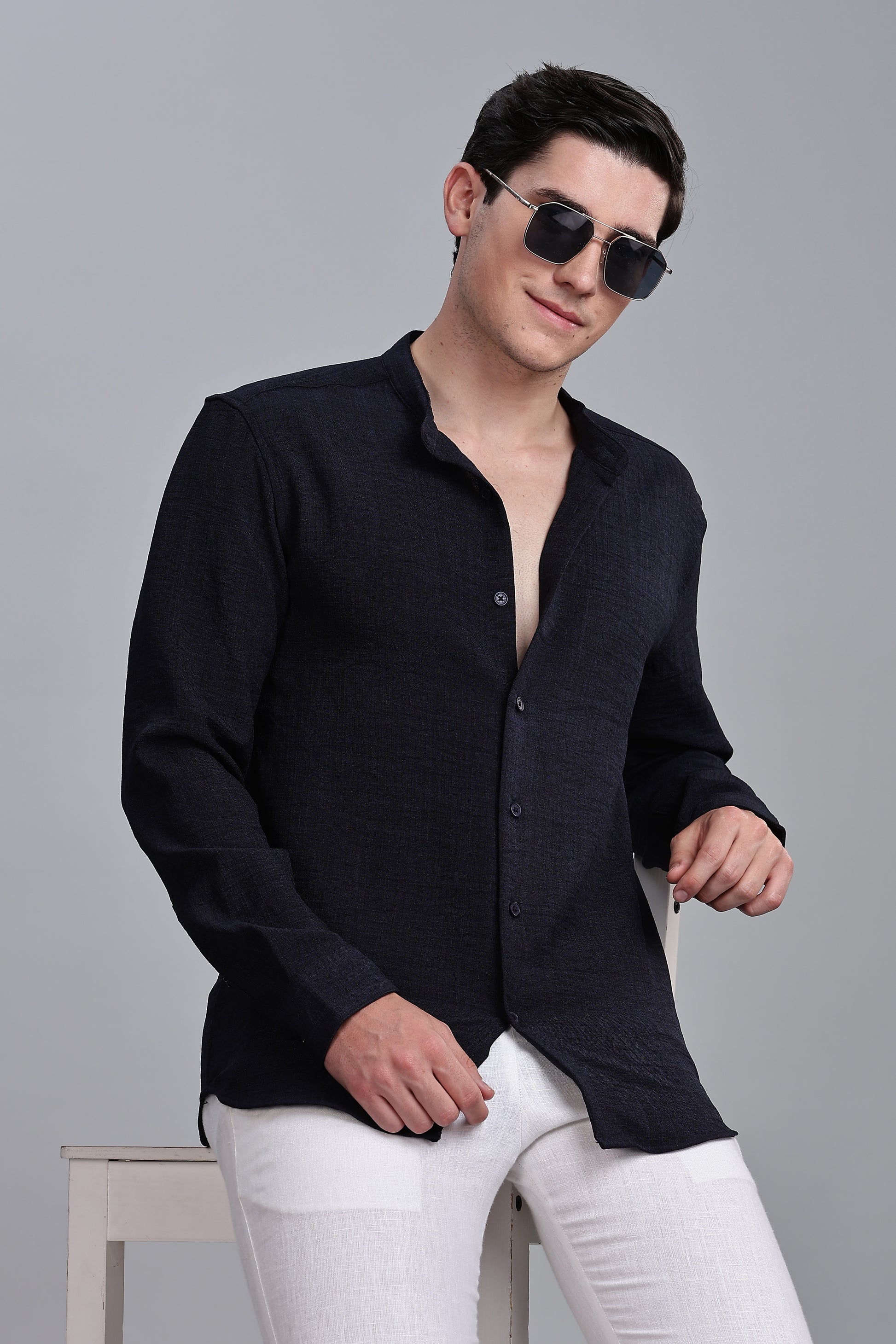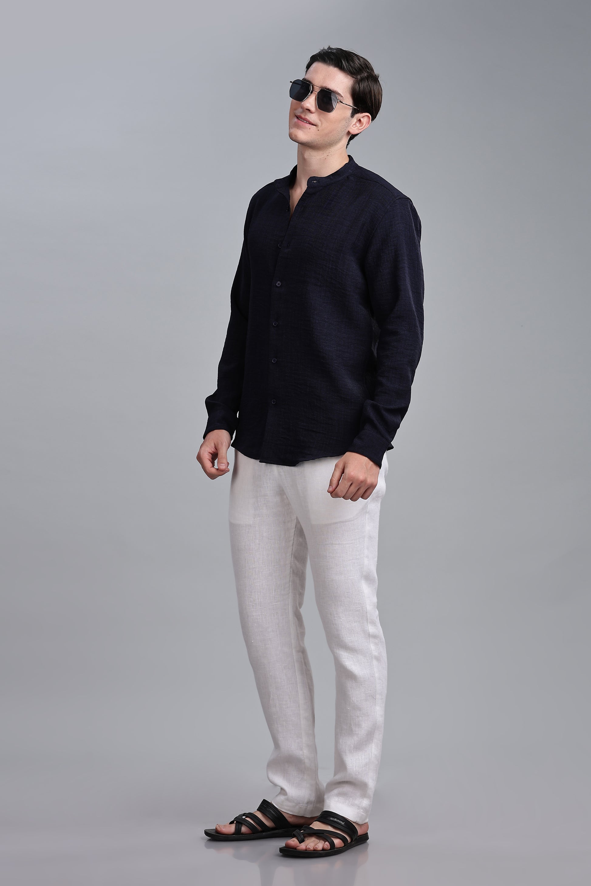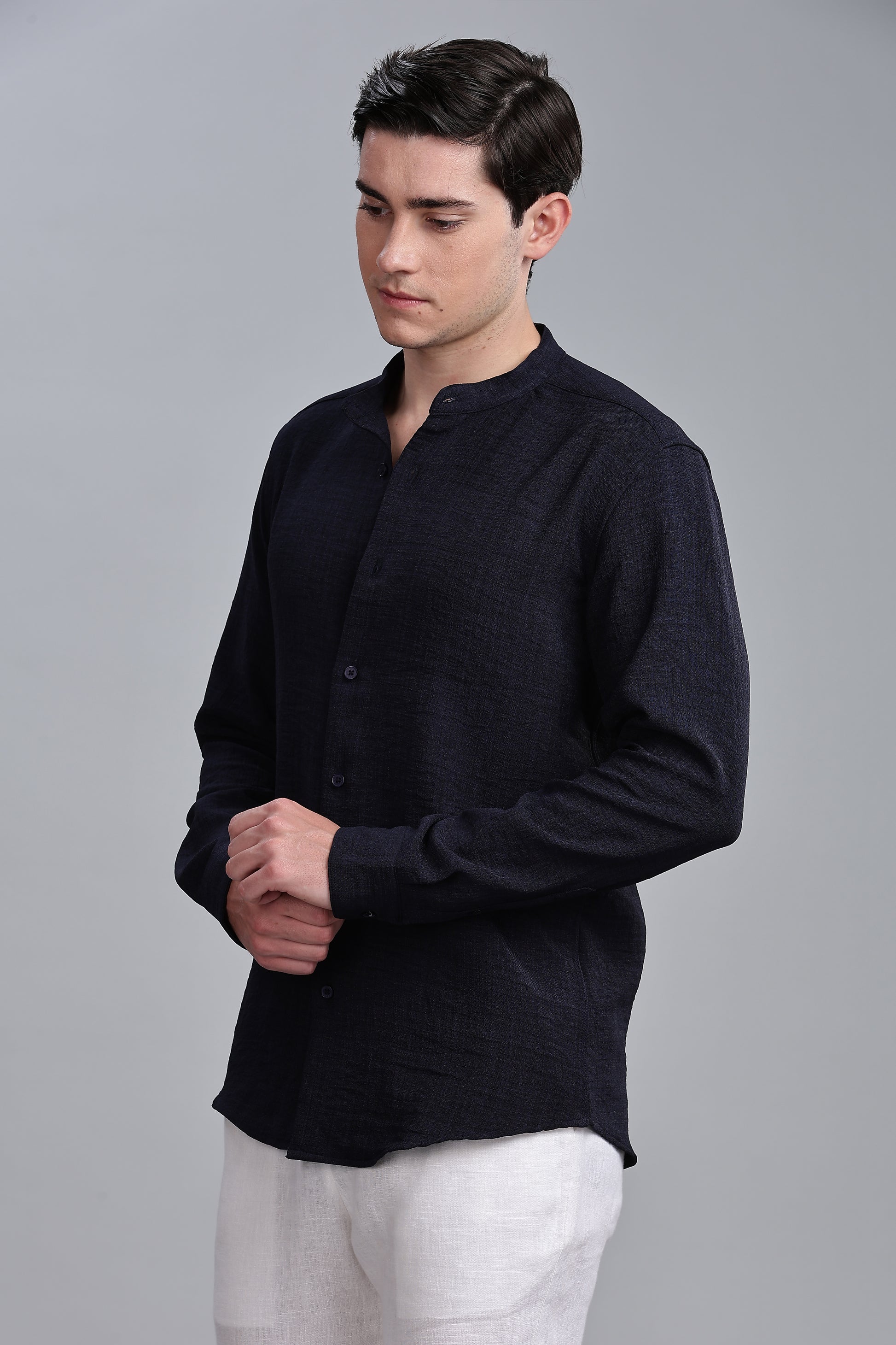 Navy Blue Linen Blend Mandarin Collar Shirt
